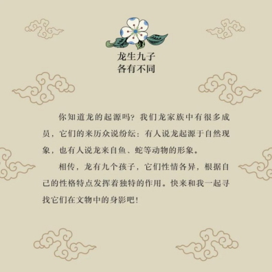 從2月到12月,如意更發(fā)現(xiàn)了“龍生九子”的故事,原來(lái),在鐘鈕上的龍子叫“蒲牢”,在宮門上的龍子叫“椒圖”……在古老的龍家族中,有把身子彎成S形的螭龍,有在空中振翅飛舞的應(yīng)龍,還有拱起身子趴在壺上的蟠龍……精選的故宮官式建筑上的和璽彩畫、大氣精美的九龍壁和千龍吐水的螭首奇觀,都讓如意著迷而向往。