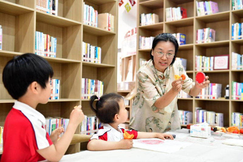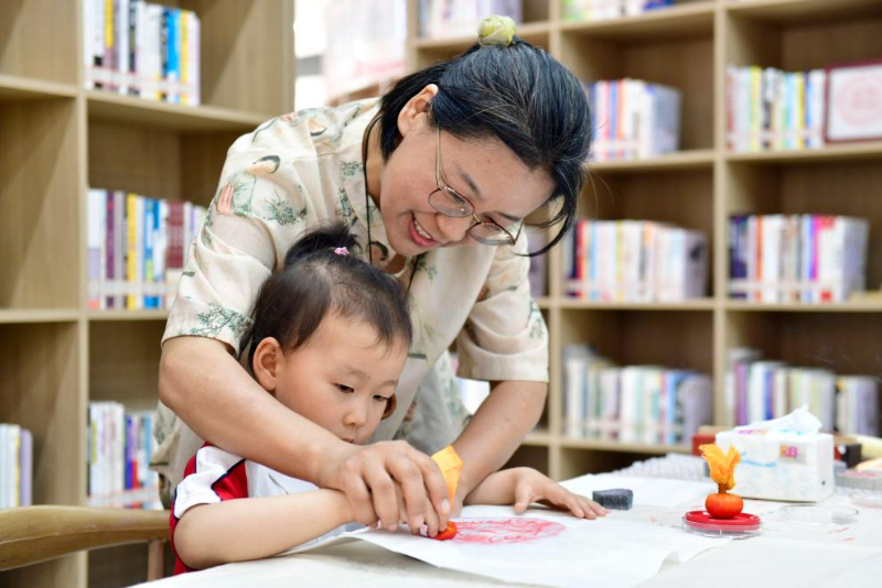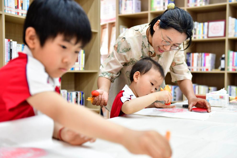 5月23日,在日照市東港區(qū)城市書(shū)房石臼所館,志愿者在教孩子拓印。