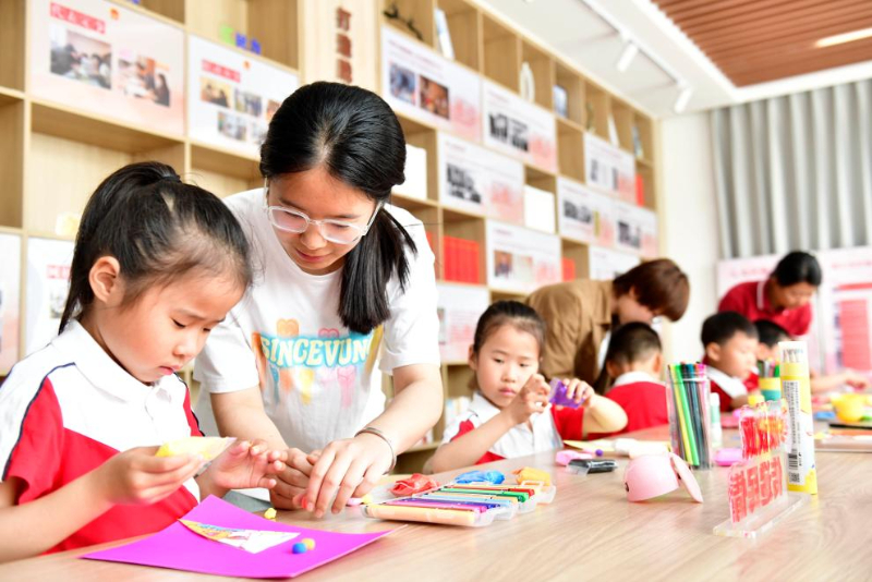 5月23日,在日照市東港區(qū)城市書(shū)房石臼所館,志愿者在教孩子制作黏土畫(huà)。