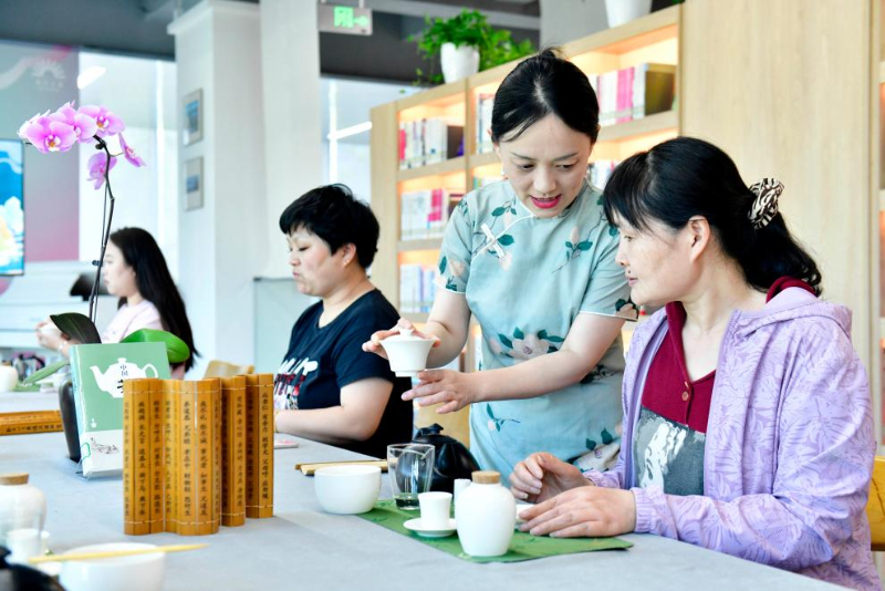 5月23日,市民在日照市東港區(qū)城市書(shū)房櫻花園館學(xué)習(xí)茶藝。