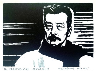 在此畫的構(gòu)思中,賴少其沒有一味地突出魯迅形象之高大而使之充塞整個畫面,而是將魯迅的頭像設(shè)計(jì)在小小的墨瓶上,與右側(cè)燃燒自己、照亮他人的蠟燭相呼應(yīng)。賴少其在畫作中并沒有簡單地堆放書和筆這類塑造知識分子形象的常用物象,而是從自己對魯迅精神的理解出發(fā),充分發(fā)掘木刻藝術(shù)黑中見白的語言特質(zhì),采用以物喻人的方式塑造了魯迅為青年的進(jìn)步甘為“一木一石”的形象,別具深度。