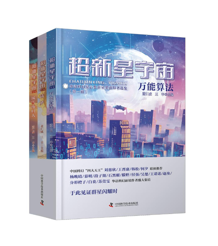 《超新星宇宙》由著名科普科幻作家董仁威、著名科幻學(xué)者三豐主編,第一輯分為《萬能算法》《鑄夢(mèng)》《風(fēng)雪夜歸人》共三冊(cè),收錄了榮獲第十、十一、十二屆華語科幻星云獎(jiǎng)2016-2020年度新星獎(jiǎng)獲得者楊晚晴、慕明、段子期、石黑曜、滕野、付強(qiáng)、吳楚、王諾諾、趙壘、分形橙子、白賁、蘇莞雯等12名新銳作者的18篇作品。