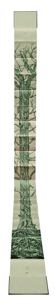 除了材料語言的拓展,展覽中的許多作品還展現(xiàn)出設計形式的創(chuàng)新與突破。如陳潔瑩的《蟬鳴樹語》聚焦了蟬絢爛而短暫的生命軌跡。書籍的裝幀方式采用經(jīng)折裝,當書本徐徐展開,一棵參天古樹好似拔地而起,貫通全書首尾。由樹根處為起點向上閱讀直至樹冠,可見蟬從卵枝到若蟲,再經(jīng)歷脫殼變?yōu)槌上x的歷程。經(jīng)由巧妙的形式設計,生命的輪回在書頁間流轉(zhuǎn),詮釋出動人的自然之力。
