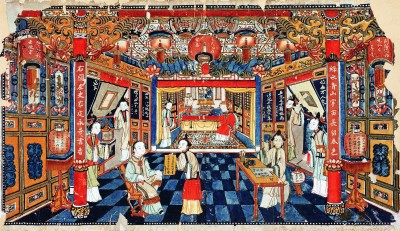 整幅年畫(huà)為我們呈現(xiàn)了一個(gè)處處燈光相映、人人語(yǔ)笑喧闐的祥和景象。畫(huà)中人物采用中國(guó)繪畫(huà)技法,線描敷色均呈現(xiàn)平面化特征,而居室空間則采用在清代稱(chēng)為“線法畫(huà)”的技法,借鑒西方焦點(diǎn)透視法,使畫(huà)面產(chǎn)生立體感,將觀者的目光緩緩引入熱鬧溫馨的場(chǎng)景之中。