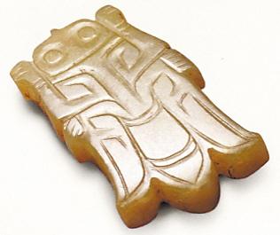 甘肅武威磨嘴子漢墓出土的一件玉蟬,長6.4厘米,寬3.1厘米,厚0.8厘米。青白玉,圓雕。腹平、背凸。玉蟬頭中部凸起,下有穿孔用于系掛。雙面用陰線雕刻出蟬的雙目、雙翼、腹、尾等輪廓。玉質(zhì)晶瑩,造型逼真,為佩玉。武威雷臺漢墓出土的一件玉帶鉤,長10厘米,寬1.5厘米,厚2.7厘米。質(zhì)地為青玉,用淺浮雕刻出。鉤首呈龍頭形,高而窄,鉤肚圓鼓,背有一圓鈕。當(dāng)是貴官豪強(qiáng)的用物。