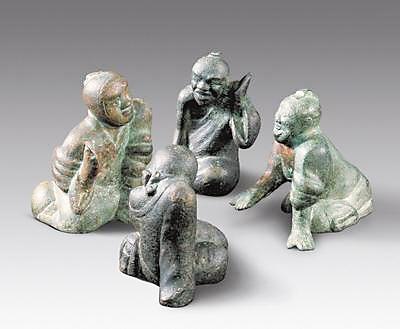 20世紀(jì)90年代甘肅靈臺縣出土了一組西漢銅質(zhì)博戲俑。俑最高9.2厘米,最寬9.7厘米。四俑相向跪坐,身著高領(lǐng)長服。其中二人頭挽發(fā)髻,二人以寬巾裹頭。坐姿不同,形態(tài)各異,有的前傾仰首,有的垂臂塌肩;有的袒胸露膊,似在伸手探取;有的屈腿斜身,默然扶膝靜坐。四俑的面部表情不同,刻畫細(xì)膩。他們或喜笑顏開,或嚴(yán)肅面對,或凝神沉思,或略顯悲愁,神態(tài)活現(xiàn),精彩逼真,具有高超的藝術(shù)性和研究價(jià)值。