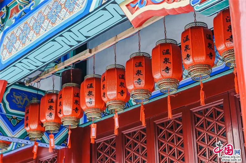 聽說這座寺廟的歷史可以追溯到400多年前,門前的石獅子十分莊嚴,傳遞著佛門圣地的意境。腳踩在雪地上,發(fā)出“嘎吱嘎吱”的聲音;進入了廟內(nèi),就能看見白雪覆蓋的木質(zhì)小橋;還有廟宇內(nèi)回廊上精致的鏤空鉤花和印著“溫泉寺”字樣的燈籠。