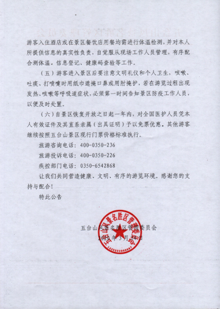 五臺山風(fēng)景名勝區(qū)強調(diào),恢復(fù)開放期間,五臺山將對景區(qū)人員密度進行實時監(jiān)控。五臺山風(fēng)景名勝區(qū)管理委員會還宣布,自景區(qū)恢復(fù)開放之日起一年內(nèi),對全國醫(yī)護人員憑本人有效證件及其直系親屬(出具證明)予以免票優(yōu)惠。