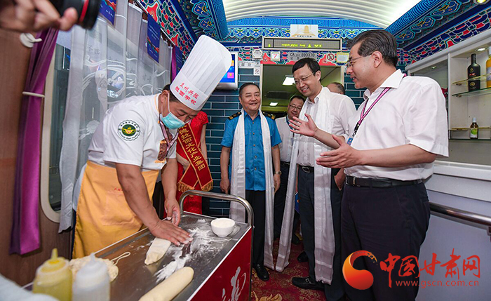 這艘“陸上郵輪”就像流動的甘肅文旅“博物館”“展覽廳”“宣傳隊”,組織全省14市州和蘭州新區(qū)文旅部門、文旅企業(yè)、媒體記者、文藝演出團隊200多人參加,集合了“吃、住、行、游、購、娛”和“商、養(yǎng)、學、閑、情、奇”等文旅全要素,用凸顯甘肅文化旅游特質(zhì)的元素包裝設(shè)計車體,將富含各市州地域特色的文創(chuàng)商品、非遺產(chǎn)品、農(nóng)特扶貧產(chǎn)品濃縮裝載到每一節(jié)車廂,并以直播帶貨的形式進行現(xiàn)場“圈粉”,直觀形象、全面精致地展現(xiàn)了甘肅文化旅游獨一無二的特色品質(zhì)。“飛天”歌舞、裕固族和白馬藏族俊男靚女的歌喉,更是深情演繹了甘肅文化的厚重、風物的絢爛、人民的熱情,盛邀八方賓客了解甘肅、愛上甘肅、投資甘肅。