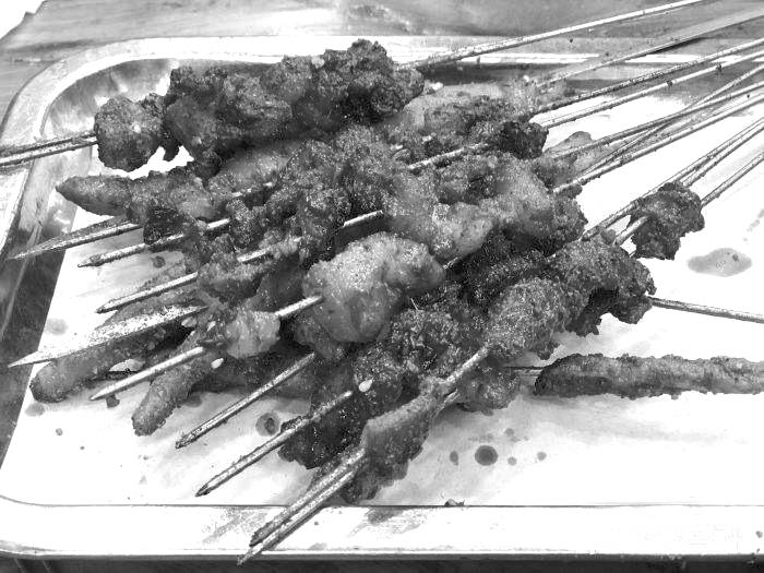 一般到下午四五點(diǎn)鐘就賣完了,把生意留給對(duì)面的烤肉??救鈱儆诟煽镜牧髋?,每一串都是三瘦一肥,很香。