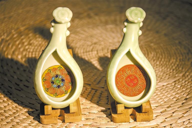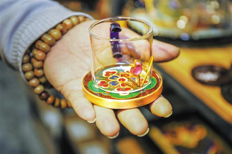 在李海明琺瑯藝術館,記者看到工藝師們正在專注地進行藝術創(chuàng)作。在展示架上,飛天琺瑯釉擺件、戲曲人物擺件、琺瑯墨匙、琺瑯茶墊等小文創(chuàng)作品令人目不暇接,就連手機殼、小鏡子這些小物件也因與琺瑯的融合變得新穎而獨特。