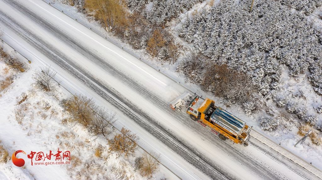 12月12日,甘肅省張掖公路局職工在國道227線撒鋪防滑料。