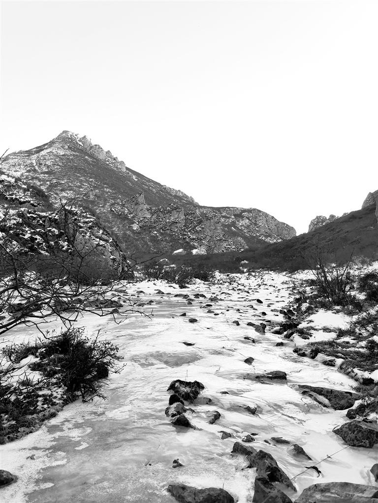 穿過(guò)公路就來(lái)到露骨山腳下,山間灌木叢生,枯葉凋零,一夜的小雪也使天空更加清澈。上山的路,總體是溯溪而上,不過(guò)腳下的小溪已經(jīng)變成冰河,但潺潺水聲不時(shí)在耳邊響起,大小石塊橫亙?cè)诒又?,白雪覆蓋其間,我們一行沿著前人在雪地留下的腳印,撥開(kāi)齊胸的灌木枝,深一腳淺一腳、兜兜轉(zhuǎn)轉(zhuǎn)向前行。