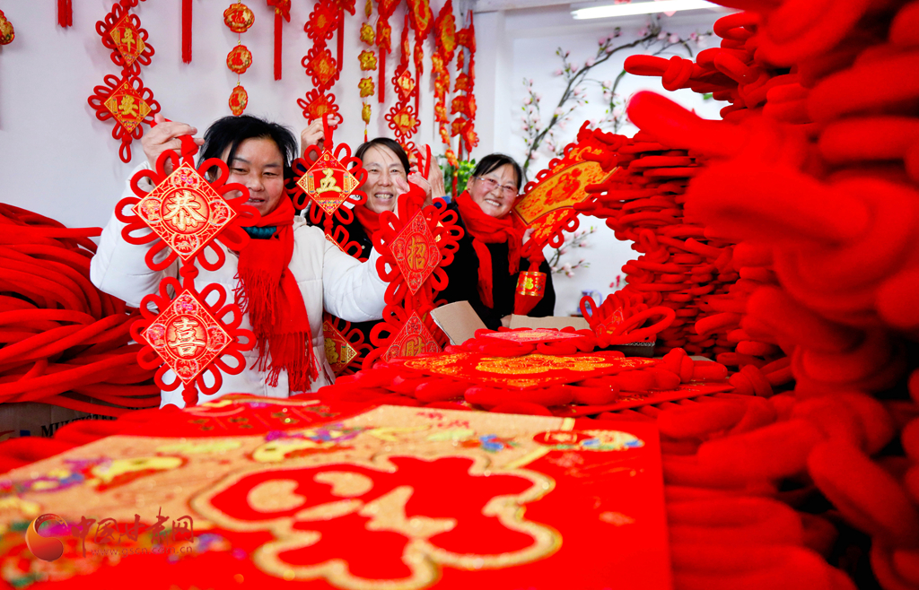 1月6日,甘肅民樂(lè)生態(tài)工業(yè)園區(qū)的巾幗扶貧車間內(nèi),編織女工正在緊張忙碌地抓緊編織中國(guó)結(jié),供應(yīng)節(jié)日市場(chǎng),喜迎新春。