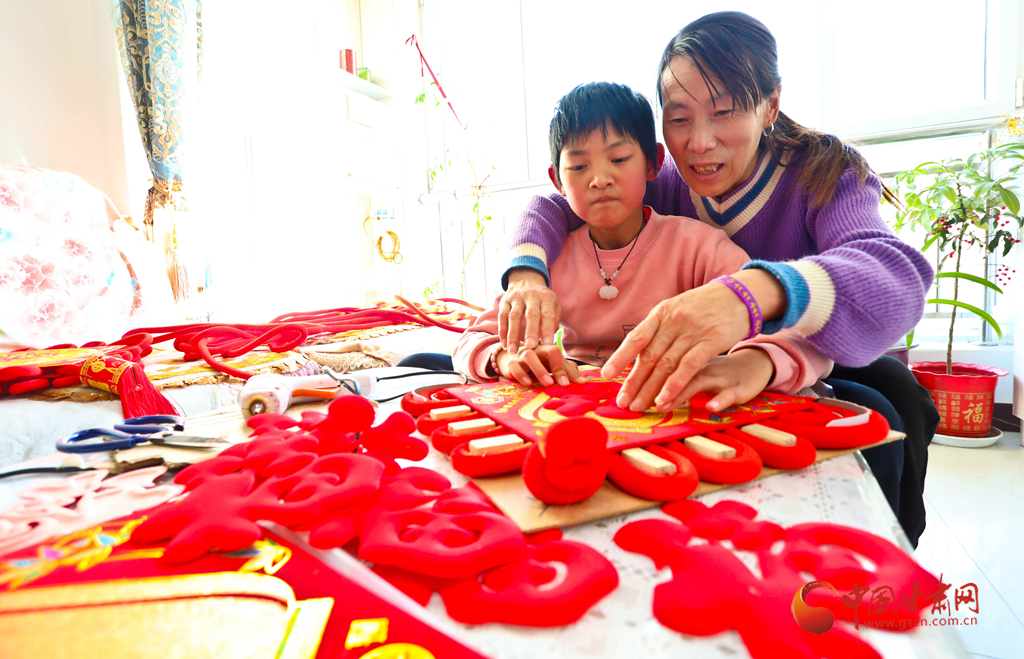 1月6日,甘肅民樂(lè)生態(tài)工業(yè)園區(qū)的巾幗扶貧車間內(nèi),女工們正在教授小朋友編織中國(guó)結(jié)。