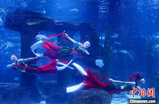 身著綠衣紅褲的飛天舞蹈服、腳穿雙蹼,在5米多深的人造海水中與海洋精靈共舞,在蘭州極地海洋世界,三位“美人魚”表演“海底飛天”,吸引眾多游客觀看。