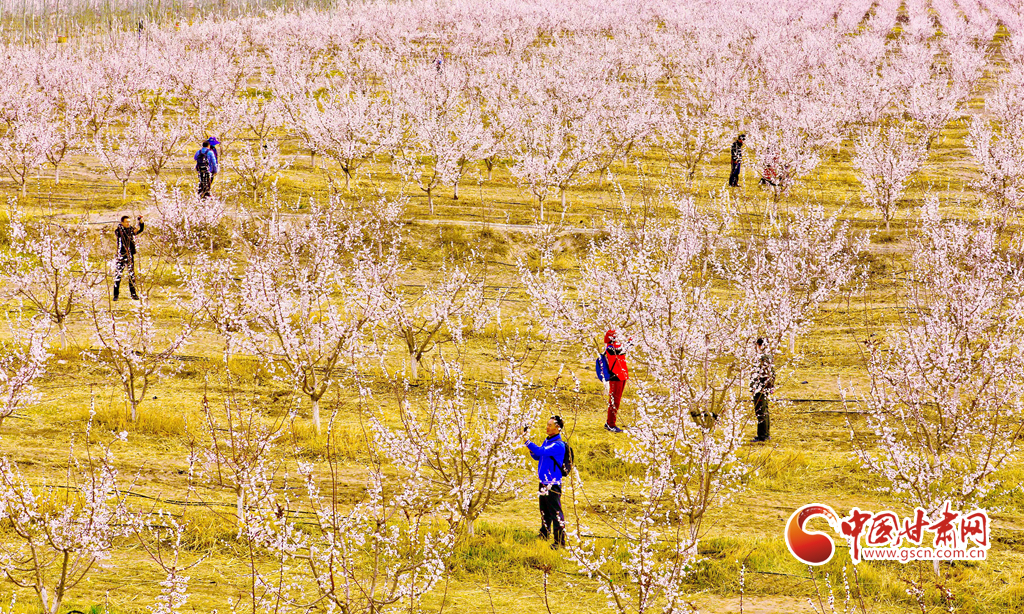 4月3日,游客在祁連山下的甘肅張掖甘州區(qū)金滿(mǎn)園千畝杏園種植基地里賞花和拍照留念。