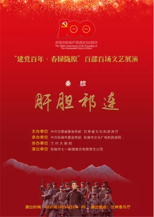 中國(guó)甘肅網(wǎng)5月28日訊(本網(wǎng)記者 宋芳科)5月30日晚,剛剛斬獲第六屆甘肅戲劇紅梅獎(jiǎng)大賽“紅梅劇目獎(jiǎng)”第一名的好成績(jī)的秦腔戲《肝膽祁連》,將在蘭州音樂廳精彩上演?!陡文懫钸B》以真實(shí)的歷史故事改編,講述了民主人士高金城營(yíng)救紅西路軍戰(zhàn)士的感人故事。屆時(shí),中國(guó)甘肅網(wǎng)將現(xiàn)場(chǎng)直播,歡迎廣大網(wǎng)友點(diǎn)擊進(jìn)入直播間,重溫一段波瀾壯闊而又感人至深的歷史,一起向祁連英魂高金城致敬。