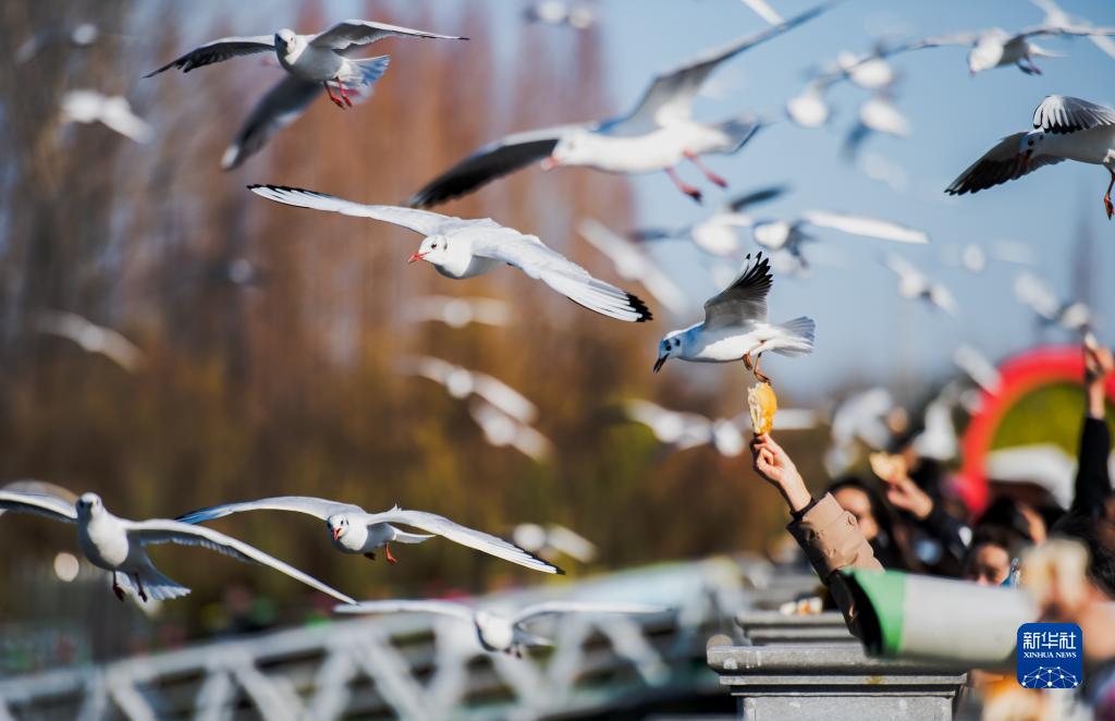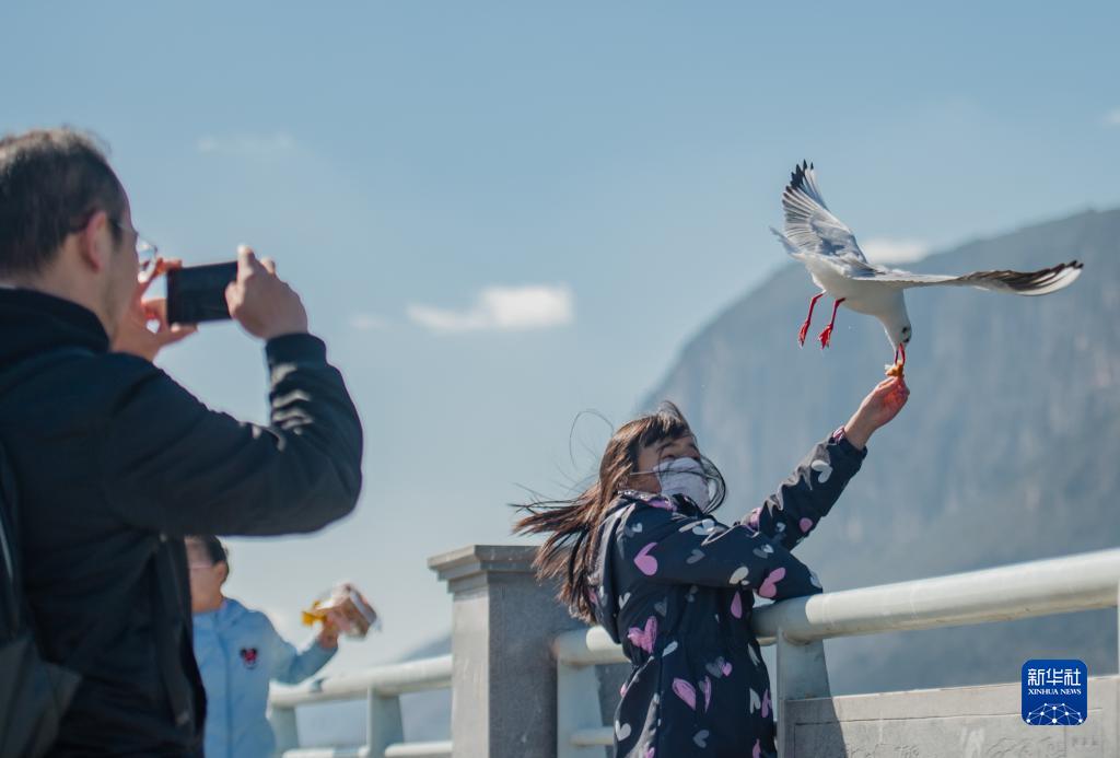 1月23日,游人在昆明市滇池海埂大壩上觀賞、投喂紅嘴鷗。