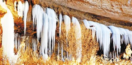 小路隨著山勢,曲折延伸。對面荒坡上隨處可見大大小小的洞穴,不知是經(jīng)年風(fēng)蝕,還是人工開采沙子所致。洞穴四周,散落著小小的冰瀑,有的似乎只有盈盈一握。長長短短的冰掛,一綹一綹,一排一排,遠(yuǎn)遠(yuǎn)近近錯落有致地覆在山坳里,垂在砂石間,掛在懸崖上。一些細(xì)細(xì)長長的冰溜,像極了臘月里母親剛出鍋的粉條。搭在院子竹竿上的一掛粉條,下邊還垂著水珠,上邊早已凍成了細(xì)細(xì)的冰棒,而滴落在地上的水已凝成了冰堆。