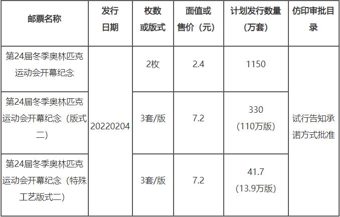今日,國家郵政局公布《第24屆冬季奧林匹克運(yùn)動(dòng)會(huì)開幕紀(jì)念》紀(jì)念郵票計(jì)劃發(fā)行數(shù)量及仿印審批目錄情況。