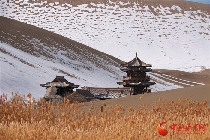 雪后的甘肅省敦煌市鳴沙山月牙泉景區(qū)景色如畫、銀裝素裹,美不勝收。