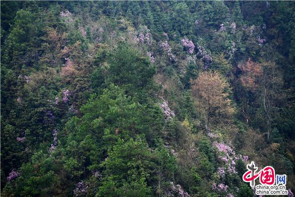 春天的穿巖山國家森林公園,漫山花開,層林盡染春色。這時候的野櫻花、野杜鵑、野映山紅竟相綻放,條條游步道宛如一條條花帶,帶著生機勃勃和滿天飄舞的芳香,讓游人心曠神怡。走在一條條蜿蜒的棧道,鮮氧環(huán)伺,鼻息間盡是春風(fēng)吹來的清新氣息。這里人文歷史與自然美景交融,既可在蜿蜒的茶馬古道,重走紅軍路,感受偉大的革命精神,又可在越河而建、凌空百丈的5D玻璃橋體驗漫步云端的驚險刺激,還可在寧靜愜意的云端古村落,感受淳樸的民風(fēng)和歷史悠長的農(nóng)耕文化奇葩。早晨的日出云海,中午的藍圖白云,下午的燦爛夕陽,鮮花與藍天、彩霞相映,讓人流連忘返。漫山遍野的綠意間,成團櫻花、杜鵑、映山紅等夾雜其中,或粉紅或雪白,或紫色或丹紅,密密匝匝開滿枝頭。由于雪峰山景區(qū)的落差較高,從300米到1500米,櫻花期、杜鵑花期、映山紅花期交錯,成梯級往山背梯田景區(qū)、虎形山大花瑤綻放開來,讓賞花期能長達2、3個月之久。