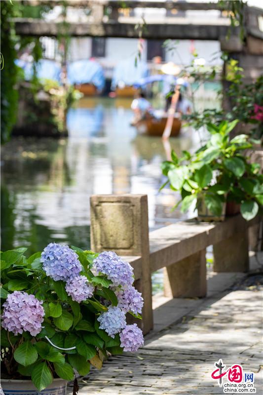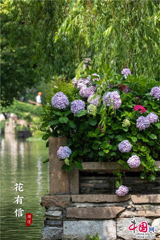 花團錦簇一詞大約是為繡球量身定制,微風一曳,波光親吻一曳。藍紫開遍,彌漫的淡淡花香讓春天的信使忍不住沉溺其中,周莊的浪漫大抵關(guān)乎世間一切。