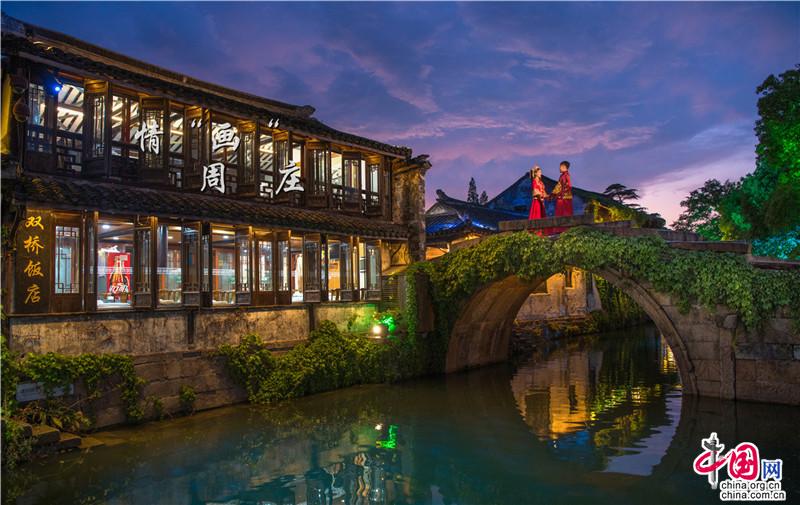 雙橋如畫,入畫周莊。牛郎織女七夕鵲橋相會,而我與你邂逅在江南水鄉(xiāng)。人間煙火至,攜手水鄉(xiāng)游,夜色下隱隱約約的古橋,仿佛是叩響幸福之門的鑰匙,溫柔靜默,流淌著時(shí)光,好似走過,便可白頭偕老。