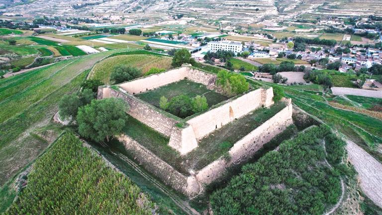 漫步騾子灘,附近的水家坡堡子也值得一去。這個堡子呈正方形,占地超4畝,不管從哪個視角看,都稱得上震撼。堡子分上下兩層,下層高5米、寬5米、邊長55米,上層高6米、底部厚3.5米、頂部厚2米、邊長35.5米。堡子外圍修有一圈寬5米、深6米、總長230余米的壕溝,曾為護(hù)城河。堡子約建于1946-1948年間,用來辦公和防御戰(zhàn)爭。1949年8月,解放軍在水家坡地界圍剿國民黨馬步芳部隊,經(jīng)過一天一夜戰(zhàn)斗,馬步芳部隊潰敗逃往新營方向,當(dāng)時有一發(fā)炮彈落在堡子一角,至今炮坑清晰可見。