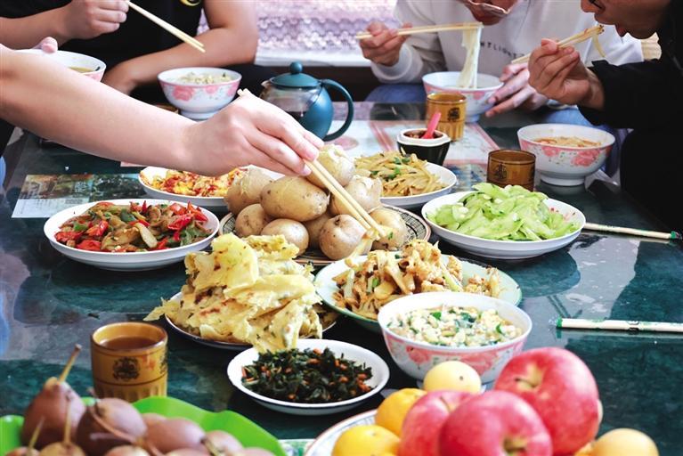 金萬裕今年77歲,留著山羊須,筋骨強健,精神矍鑠。他家有21畝地,洋芋今年就種了10畝。當(dāng)天,是他家挖洋芋的第二天,孫子挖,金萬裕撿。這里的紅洋芋,淀粉含量高,秧有半人之高。臨近中午,金萬裕邀記者回家吃洋芋。在寬敞透亮的新房子里做客,喜悅的氣氛和一桌洋芋宴足以讓人解饞、解乏,尤其是“破皮襖”(油壺喧)就洋芋菜,簡直是一絕。種植一直是金家的一份可觀收入,洋芋、大豆都是盼頭,如今房子住套院,孫子在開塔吊,三代人和諧幸福。