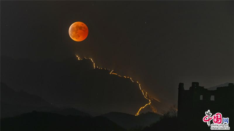 11月8日,月全食(紅月亮)天象驚艷亮相金山嶺長城。(紀正權(quán) 張愛東)