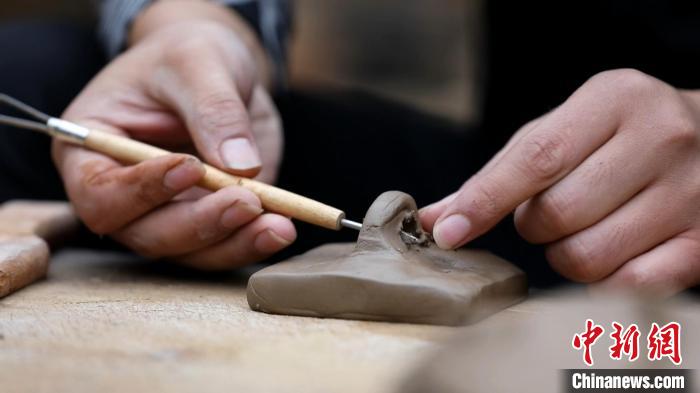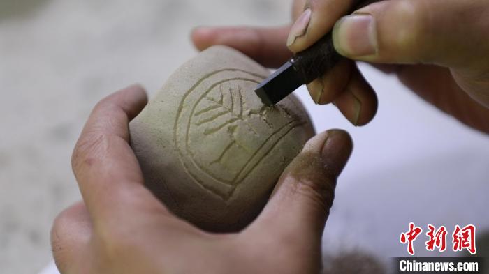 蔣繼濤說(shuō),柴燒陶印的制作過(guò)程,結(jié)合了書(shū)法繪畫(huà)、手工雕塑等技藝。“陶印的制作流程主要包括選土、配土、過(guò)濾、沉淀、制紐、晾曬、打磨、篆刻、入窯、燒制等程序,不僅要精通書(shū)法篆刻,還要熟悉雕法、燒窯等。”蔣繼濤一邊介紹,一邊手持刻刀。鋒利的刀尖在陶印上不斷游走,吹去浮塵,一枚古樸的柴燒陶印制作完成。