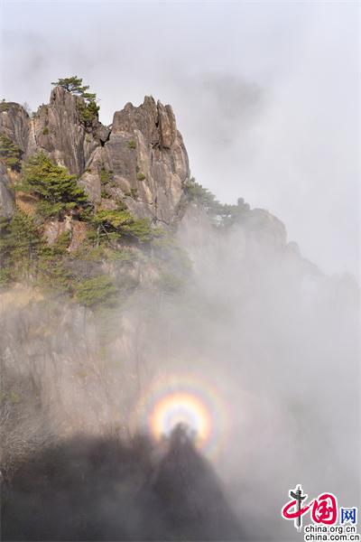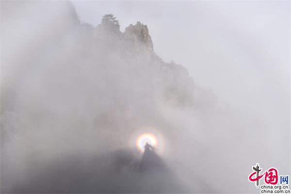 原標題:安徽黃山:云海和佛光演變?nèi)鐗羧缁靡饩?/p>