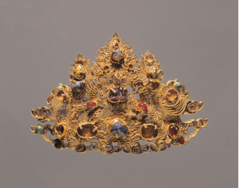 【鑲寶石金帽飾·明代·蘭州出土】帽飾分兩層,底層以極細的金絲盤繞成繁密的渦狀卷草紋;上層中間的金片鏨刻出如意云紋,兩側各有一金鳳,帽飾上鑲綴各種寶石。