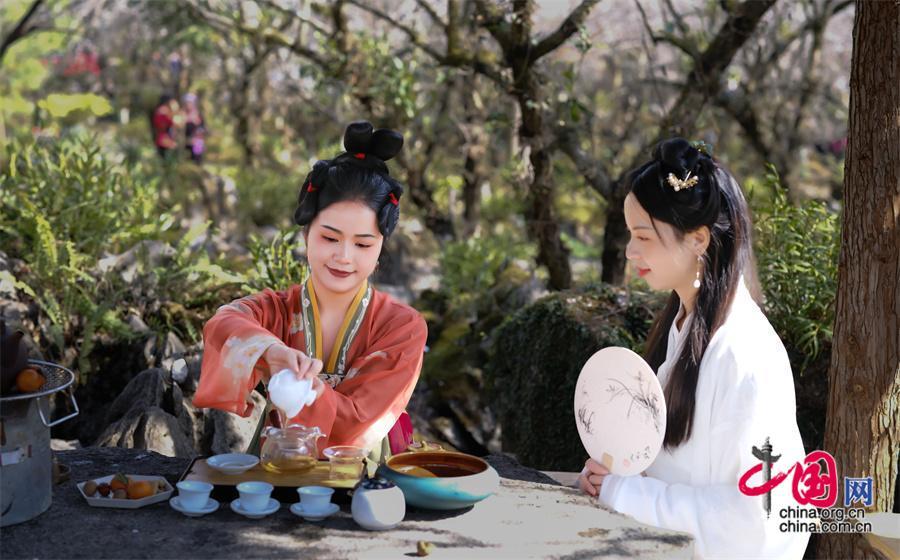 一朵梅花寓五福,一山梅花賀新春。梅原里,游客們或賞花祈福、或獨自品溫,或拍照打卡,盡情享受賞梅樂趣。還有不少游客,為了應(yīng)景,更是穿著古風漢服或少數(shù)民族服飾,沉浸式打卡梅花節(jié),游客林女士說:“古裝配梅花,清麗脫俗,既感受到傳統(tǒng)文化之美,也為賞梅之旅增添了色彩。”