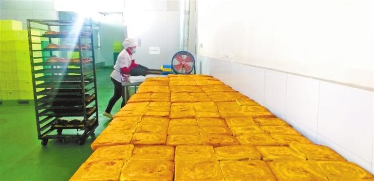 “揉面、搟面、抹餡料……”手工制作線上一位大姐告訴記者:“目前我們有手工生產和全自動生產兩條線,分別生產千層餅傳統(tǒng)面點和玫瑰餅等新型糕點。傳承祖上燒餅制作技藝,工人們要在前一晚和好面,面團經過一夜的醒發(fā)后,天剛亮再交由經驗老到的師傅打堿,揉面、搟面,涂抹苦水玫瑰醬、胡麻顆粒、香豆粉、姜黃粉等餡料,卷制成型,在千層餅正面撒上芝麻,就可以上烤箱了,大約每天上午10點前烘烤好的千層餅會送往永登各銷售點。”