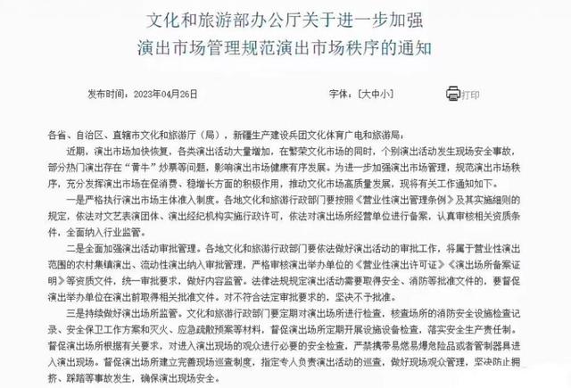 近日,文旅部辦公廳發(fā)布《文化和旅游部辦公廳關(guān)于進(jìn)一步加強(qiáng)演出市場(chǎng)管理規(guī)范演出市場(chǎng)秩序的通知》。通知提到,對(duì)臨時(shí)搭建舞臺(tái)、看臺(tái)的演唱會(huì)、音樂(lè)節(jié)等大型演出活動(dòng),文化和旅游行政部門要做好演出現(xiàn)場(chǎng)監(jiān)管,查驗(yàn)演出舉辦單位的演出批準(zhǔn)文件及相關(guān)手續(xù),核驗(yàn)演員信息及演出節(jié)目?jī)?nèi)容,嚴(yán)禁擅自變更演員及演出內(nèi)容,嚴(yán)禁假唱、假演奏等違法違規(guī)行為。