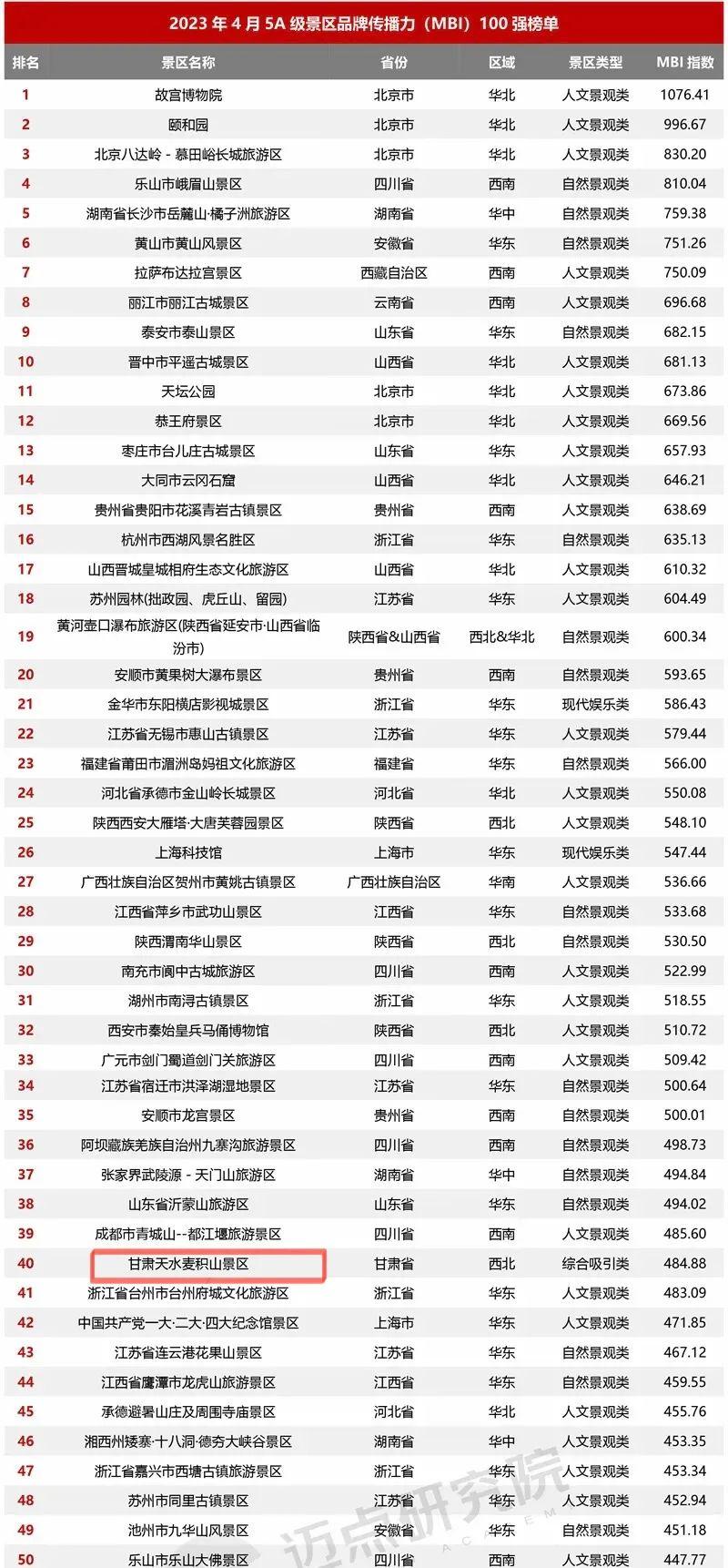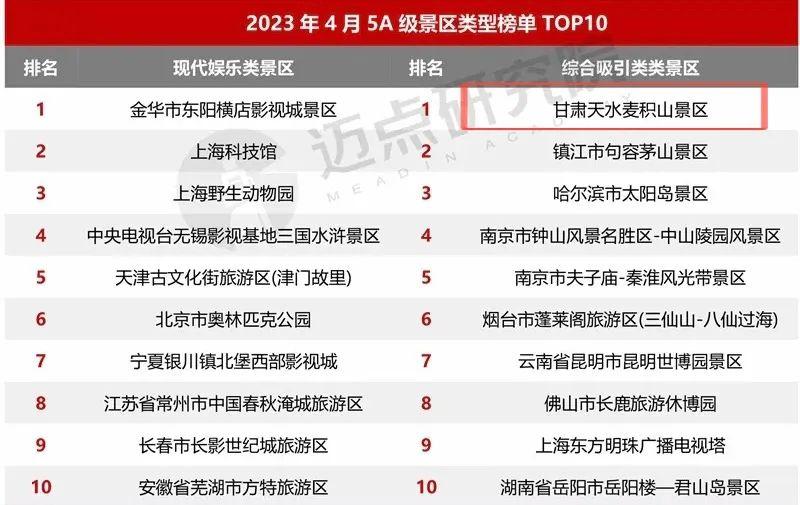 2023年4月5A級(jí)景區(qū)品牌傳播力100強(qiáng)榜單上,熱烈祝賀麥積山景區(qū)榮登國(guó)內(nèi)文旅行業(yè)最具影響力的權(quán)威數(shù)據(jù)分析機(jī)構(gòu)“邁點(diǎn)研究院”4月5A級(jí)旅游景區(qū)品牌傳播力百?gòu)?qiáng)榜單前五十和綜合類(lèi)旅游景區(qū)第一、西北地區(qū)分項(xiàng)榜單第五。