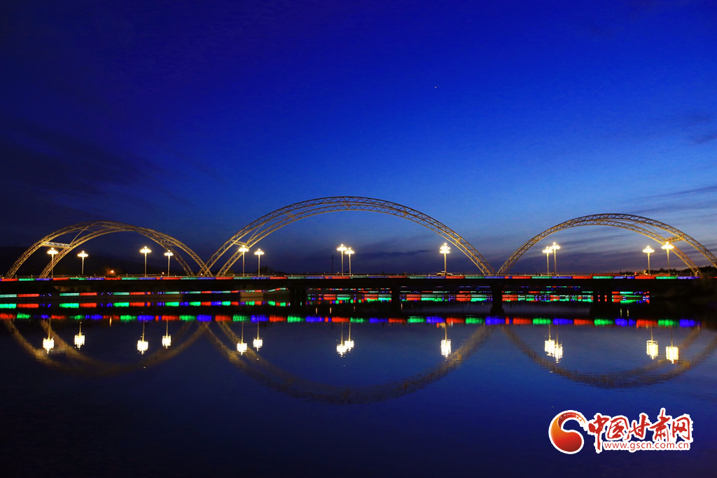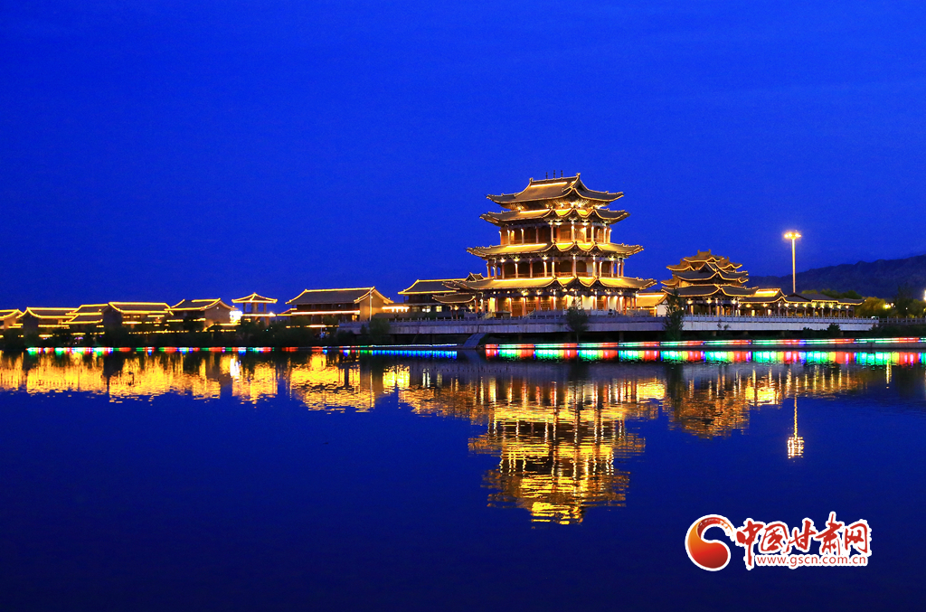 7月5日,甘肅省嘉峪關市南湖討賴河畔晚霞如輝,夜景璀璨,構成一幅美麗的夏日畫卷。
