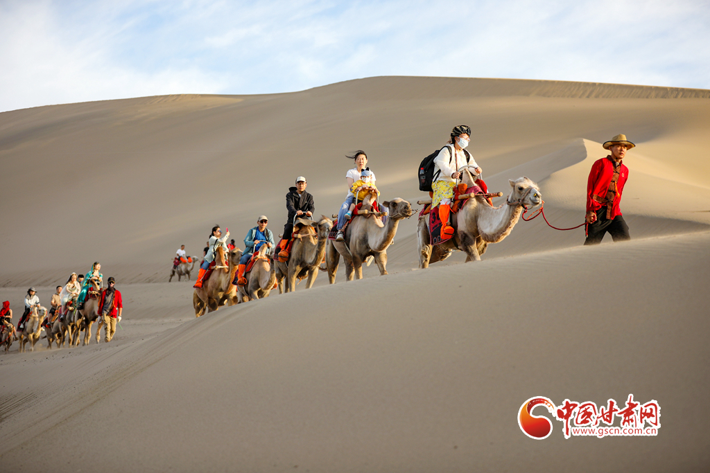 在甘肅敦煌鳴沙山月牙泉景區(qū),游客騎乘駱駝感受大漠風(fēng)光。