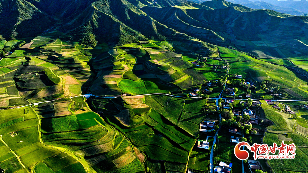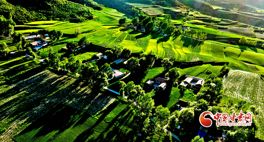 夕陽映襯下的祁連山北民樂縣豐樂鎮(zhèn)易家灣村,綠油油的莊稼生長旺盛,林木蓊郁層林盡翠,呈現出生機勃勃的景象,猶如“巨幅綠毯”。
