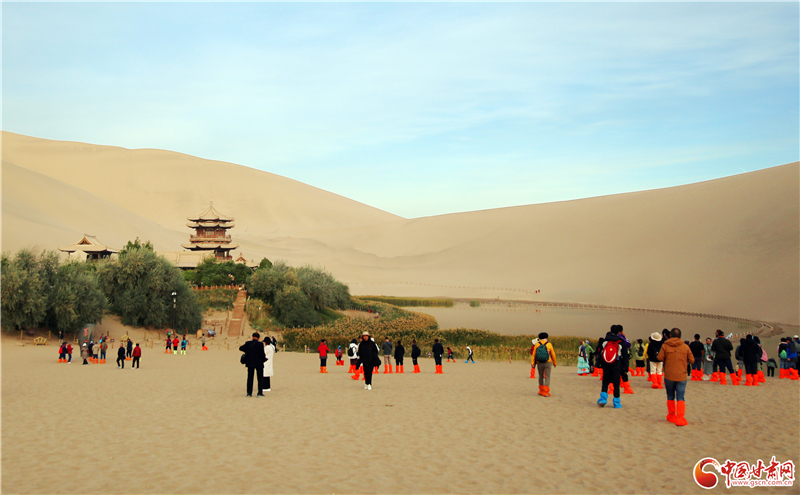 鳴沙山以沙動成響而得名,峰巒危峭,山脊如刃。最早在東漢辛氏《三秦記》中有“河西有沙角山,峰崿危峻,逾于石山,其沙粒粗色黃,有如乾糒……人欲登峰,必步下入穴,即有鼓角之聲,震動人足”的記載。而月牙泉是環(huán)抱在鳴沙山中的一灣清泉,形如玄月,故名“月牙泉”,并形成了鳴沙山月牙泉景區(qū),被譽為“塞外風(fēng)光之一絕”。