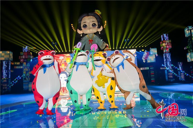 水鄉(xiāng)錦鯉,有福有喜,錦鯉飛魚秀徜徉在舞臺與燈組之間。