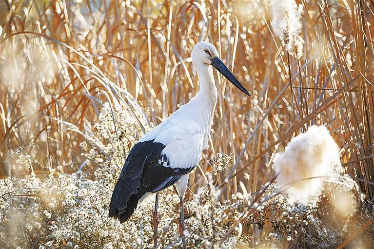 東方白鸛是一種大型涉禽,為鸛形目鸛科鳥類。其體態(tài)優(yōu)美,成鳥體長超過1米,黑翅白體,赤腳長喙,棲息于開闊的沼澤、湖泊和潮濕草地。東方白鸛是少見的旅鳥,因繁殖分布區(qū)域狹窄,野生種群數(shù)量極為稀少,在《世界自然保護聯(lián)盟瀕危物種紅色名錄》中屬于瀕危等級,是我國一級重點保護野生動物,有“鳥界國寶”“鳥類大熊貓”之稱。