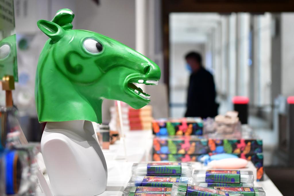 在甘肅省博物館文創(chuàng)商店拍攝的以銅奔馬為主題設(shè)計的“綠馬頭套”(2022年5月13日攝)。新華社記者 陳斌 攝