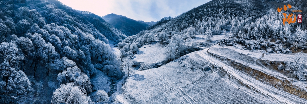 關(guān)山被白雪覆蓋,滿山樹木掛滿了晶瑩的雪花,好像穿上了潔白的婚紗,格外美麗。