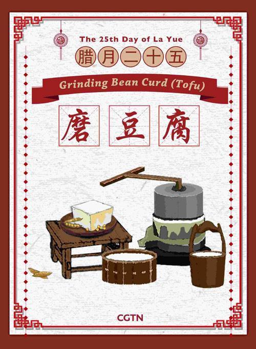 傳說玉皇大帝會(huì)在臘月二十五下凡巡視人間,看家家戶戶是否都過著誠(chéng)實(shí)勤儉的生活。為了表現(xiàn)得節(jié)儉以獲得玉皇大帝降福,傳統(tǒng)上人們會(huì)磨豆腐來吃,豆腐在中國(guó)是一種便宜的食品。