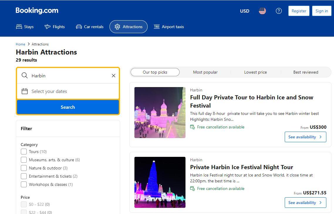 在酒店及住宿在線預(yù)訂平臺Booking.com上,可以搜索到近30個關(guān)于哈爾濱旅游的服務(wù)。其中,“哈爾濱冰雪節(jié)全日私人旅游”包括私人汽車和導(dǎo)游費用,不包括門票收費300美元,包括門票則收費480美元。“哈爾濱冰雪節(jié)私人夜游”包括私人汽車、私人旅游、酒店接送、門票,收費271.55美元起。