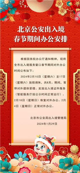 據(jù)北京市公安局出入境管理局官方微博消息,北京市公安局出入境管理局發(fā)布春節(jié)期間辦公安排:北京市出入境服務(wù)窗口2月10日至17日(大年初一至初八)放假調(diào)休,共8天。期間,暫停對外提供受理、發(fā)放出入境證件服務(wù)(智能服務(wù)廳按公示時間正常運(yùn)行)。